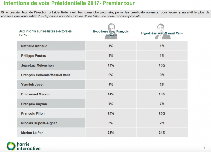 Se Hollande si fosse candidato avrebbe vinto il primo turno delle primarie contro Montebourg con il 40 per cento dei voti, na avrebbe perso al secondo turno con il 48 per cento contro il 52 di Montebourg, sul quale sarebbero arrivati i voti di tutta la sinistra scontenta del presidente uscente. Manuel Valls, invece, avrebbe possibilità di farcela: otterrebbe il 44 per cento al primo turno contro il 32 di Montebourg e il 13 di Benoît Hamon e al ballottaggio vincerebbe con un ampio margine contro Arnaud Montebourg, 57 per contro 43 per cento.