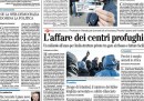 Quasi tutti i giornali di oggi aprono sulla situazione dei migranti in Italia, dopo la rivolta nel centro di accoglienza di Conetta, in provincia di Venezia, per la morte di una donna ospite del centro, e sui nuovi provvedimenti allo studio del governo su espulsioni e politiche di accoglienza. Repubblica e il Tempo aprono invece sulla proposta di Beppe Grillo di “tribunali popolari” per le bugie di giornali e tv, mentre i quotidiani sportivi titolano su fantasiose ipotesi di calciomercato.