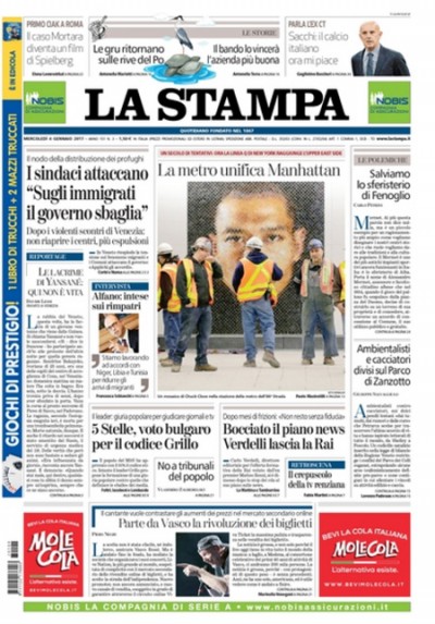 Quasi tutti i giornali di oggi aprono sulla situazione dei migranti in Italia, dopo la rivolta nel centro di accoglienza di Conetta, in provincia di Venezia, per la morte di una donna ospite del centro, e sui nuovi provvedimenti allo studio del governo su espulsioni e politiche di accoglienza. Repubblica e il Tempo aprono invece sulla proposta di Beppe Grillo di “tribunali popolari” per le bugie di giornali e tv, mentre i quotidiani sportivi titolano su fantasiose ipotesi di calciomercato.