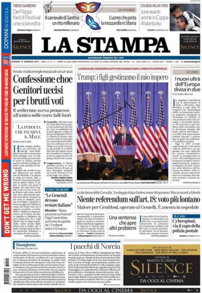 La notizia di apertura su quasi tutti i quotidiani di oggi è la decisione sui referendum sul lavoro chiesti dalla CGIL da parte della Corte Costituzionale, che ha dichiarato inammissibile quello che voleva eliminare le modifiche all’articolo 18 contenute nel Jobs Act e ha ammesso quelli sui voucher e sugli appalti. Il Giornale apre invece sulla vicenda di cyberspionaggio per la quale sono stati arrestati l’altro ieri due fratelli a Roma, Libero e il Tempo si occupano del Monte dei Paschi di Siena, e la Stampa della confessione del figlio che ha ucciso i genitori vicino a Ferrara, mentre i quotidiani sportivi titolano sulla vittoria della Juventus sull’Atalanta in Coppa Italia.