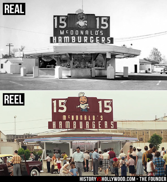 The Founder inizia nel 1954, quando Kroc viene a sapere dei fratelli McDonald e decide di incontrarli. I fratelli gli raccontano la loro storia, e il film la mostra in modo attendibile nella scena che alterna il loro racconto al ristorante con alcune vere immagini di quegli anni. I fratelli – noti come Dick e Mac McDonald – erano nati nei primi anni del Novecento e iniziarono aiutando il padre nel suo ristorante, per poi aprirne uno loro. Nel 1940 i McDonald aprirono un drive-in che faceva soprattutto hot-dog, in California; nell’autunno del 1948 lo chiusero per alcune settimane, per cambiare il modo in cui le cose venivano fatte e vendute, e renderlo più semplice e veloce. Non ci sono prove del fatto che i fratelli andarono davvero in un campo da tennis per disegnare per terra la nuova disposizione del locale e far provare ai dipendenti i nuovi movimenti. È vero anche che prima dell’incontro con Kroc avevano già provato ad aprire altri locali con il nome McDonald, ma che nessuno aveva avuto il successo del loro: quello di San Bernardino mostrato nel film.