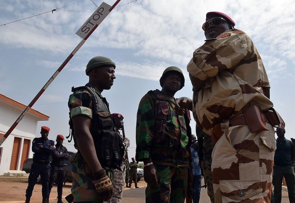 Il tenente-colonnello dell’esercito ivoriano Issiaka Ouattara mentre incontra alcuni soldati che hanno partecipato all’ammutinamento la scorsa settimana, in attesa dell’arrivo del ministro della Difesa all’aeroporto di Bouaké (SIA KAMBOU/AFP/Getty Images)