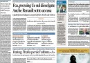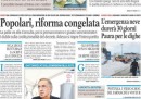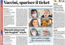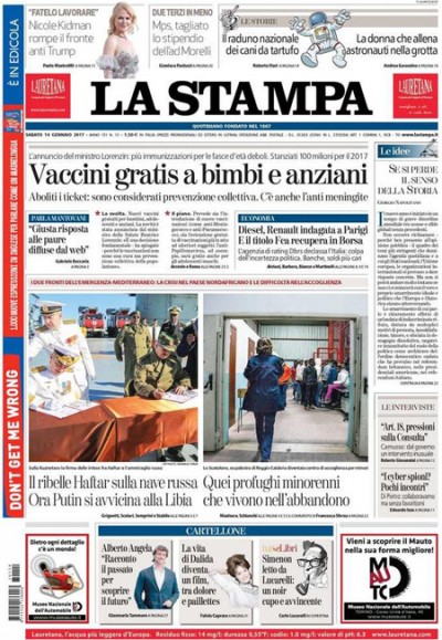 I giornali di oggi si occupano in apertura di notizie diverse: alcuni titolano sui nuovi livelli essenziali di assistenza nella sanità pubblica approvati ieri dal governo, che allargano il campo delle prestazioni per le quali non si pagherà il ticket, altri sul rating dell’Italia secondo l’agenzia DBRS, ridotto a “BBB”, il Sole 24 Ore e il Messaggero si occupano della vicenda delle emissioni nocive delle automobili diesel, con il possibile coinvolgimento di Renault dopo quello di FIAT Chrysler, l’Unità segue i minori stranieri non accompagnati arrivati in Italia, Libero attacca il ministro dell’Economia Padoan sul decreto “salva banche”, e il Manifesto e la Verità aprono sul calo delle iscrizioni al Partito Democratico.