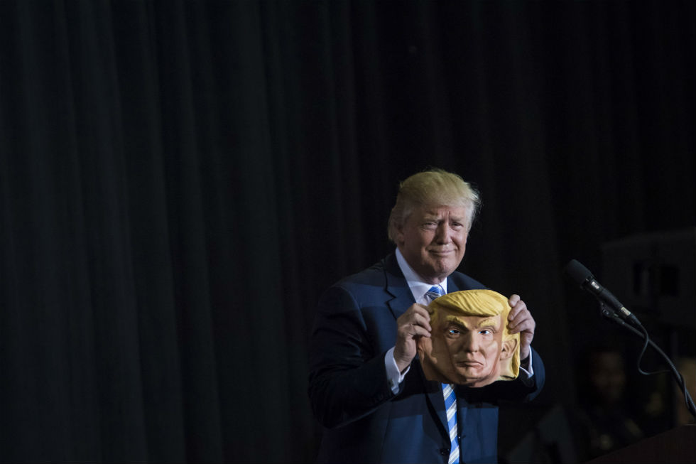 Donald Trump con una maschera di se stesso durante un evento elettorale a Sarasota, in Florida, il giorno prima delle elezioni (Jabin Botsford – The Washington Post)