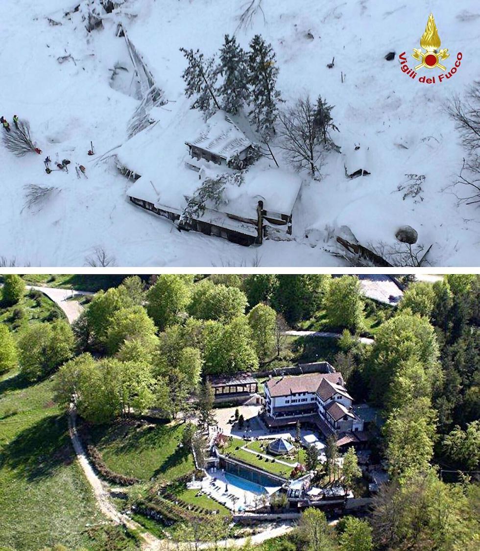 La valanga si è probabilmente formata in seguito alle intense scosse di terremoto di ieri nel Centro Italia, quattro delle quali hanno superato magnitudo 5. I soccorritori hanno impiegato molte ore per raggiungere l’albergo, rimasto completamente isolato e raggiungibile solo a piedi o in elicottero. Le immagini dall’alto riprese dagli elicotteri di Vigili del Fuoco e della Polizia di Stato mostrano l’estensione della valanga, che ha coperto buona parte dell’Hotel Rigopiano e ne ha causato anche lo spostamento di alcuni metri verso valle.