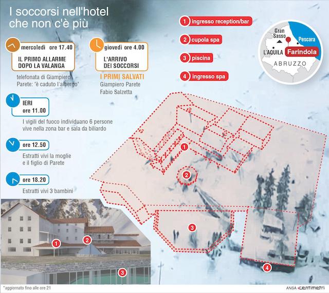 (La ricostruzione della struttura dell’Hotel Rigopiano e il succedersi dei soccorsi fino al 20 gennaio, fatta da Ansa Centimetri; dopo la realizzazione del grafico altre quattro persone sono state messe in salvo)