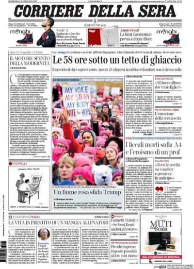 I giornali di oggi dedicano la foto in apertura per lo più alle manifestazioni tenute in tutto il mondo a favore dei diritti delle donne e contro il sessismo del nuovo presidente degli Stati Uniti Donald Trump. Si continua però a parlare dei soccorsi per i terremoti e le valanghe nel Centro Italia, e in particolare delle testimonianze delle persone estratte vive dall’hotel Rigopiano. I giornali sportivi si occupano invece della Serie A: ieri il Napoli ha battuto il Milan, oggi c’è Juventus-Lazio.