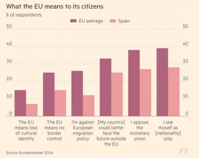 Non sono solo gli elettori di Podemos a sostenere l’integrazione europea: nonostante l’austerità e i tagli degli ultimi anni, tutti i sondaggi mostrano che gli spagnoli rimangono tra i più europeisti in Europa. Questo si spiega almeno in parte col fatto che la Spagna è stata per anni un percettore netto di fondi europei, cioè riceveva dall’Unione più di quanto versava. Soltanto negli ultimi anni contributi versati e ricevuti stanno iniziando a riallinearsi (l’Italia, invece, è da sempre un contributore netto: versa all’Europa più di quanto riceve).