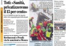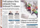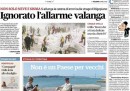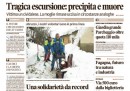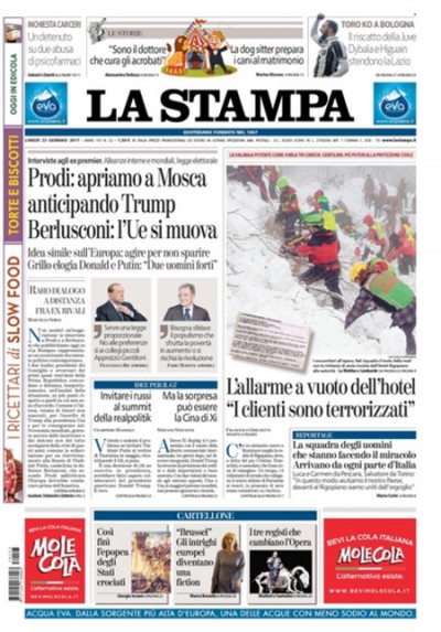 La maggior parte dei quotidiani di oggi apre ancora sulla valanga che ha travolto l’hotel Rigopiano, concentrandosi sulle richieste di aiuto inviate dall’albergo prima e dopo che venisse sommerso mercoledì scorso dalla valanga, e sulle scosse di terremoto in Italia centrale, con un allarme lanciato ieri sullo stato delle dighe nelle zone colpite. La Stampa apre invece con due interviste agli ex presidenti del Consiglio Prodi e Berlusconi, mentre i quotidiani sportivi titolano sui risultati del campionato, con le vittorie di Juventus e Roma in testa alla classifica.
