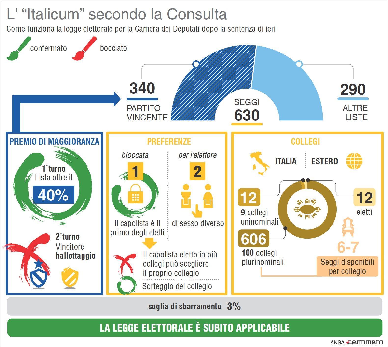 Alla Camera, la legge uscita dalla riscrittura della Corte Costituzionale e quindi attualmente in vigore è un proporzionale con soglia di sbarramento al 3 per cento. Non sono previste coalizioni: la singola lista che raggiunge il 40 per cento dei voti ottiene un premio di maggioranza che gli garantisce 340 deputati, cioè una maggioranza di circa il 55 per cento. La legge divide l’Italia in 100 collegi plurinominali, che eleggono dai 3 ai 9 deputati l’uno, tranne i 9 collegi di Trentino Alto-Adige e Valle d’Aosta, che sono uninominali. La circoscrizione estero elegge altri 12 deputati con metodo proporzionale.