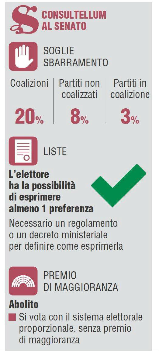 Al Senato è in vigore il cosiddetto “Consultellum”, la legge elettorale frutto della modifica da parte della Corte Costituzionale della legge elettorale approvata dal governo Berlusconi nel 2005, il famoso “Porcellum”. È una legge proporzionale, senza alcuna forma di premio di maggioranza. La legge consente di fare alleanze e coalizioni, quindi diverse liste possono presentarsi insieme con i propri simboli sulla scheda. Per eleggere senatori, le liste devono ottenere almeno l’8 per cento dei voti. Le coalizioni devono ottenere almeno il 20 per cento dei voti e i partiti che ne fanno parte almeno il 3 per cento. I voti vengono contati a livello regionale e non sono sommati a livello nazionale. Una lista o una coalizione, quindi, potrebbe superare lo sbarramento in una regione, ed eleggere alcuni senatori, e mancarlo in un’altra, non riuscendo quindi a eleggere nessuno e “perdendo” i voti ottenuti. Tutti i senatori vengono eletti tramite preferenze.