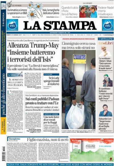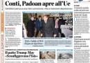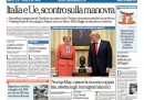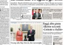 La maggior parte dei quotidiani di oggi dedica l’apertura alla trattativa fra Italia e Unione Europea sulla manovra economica richiesta per ridurre il debito, con le preoccupazioni del presidente del Consiglio Gentiloni per una manovra che potrebbe avere effetti depressivi sull’economia e quelle del ministro dell’Economia Padoan su un’eventuale procedura di infrazione. La Stampa e il Manifesto titolano invece sull’incontro di ieri a Washington fra il presidente degli Stati Uniti Trump e il primo ministro del Regno Unito May, mentre Libero si occupa del bilancio del comune di Roma.