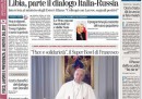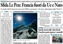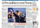 Molti giornali di oggi aprono sull’avvio della campagna per le elezioni presidenziali francesi di Marine Le Pen, che ha annunciato in un comizio a Lione di voler fare un referendum per l’uscita della Francia dall’Unione Europea e di voler uscire dal comando della NATO in caso di sua vittoria alle elezioni. La Stampa apre invece con un’intervista al ministro degli Esteri Alfano sui rapporti con la Libia per bloccare l’arrivo di migranti in Italia, Libero e il Fatto si occupano del Partito Democratico con le critiche del presidente della regione Puglia Emiliano al segretario Renzi, e il Giornale critica l’assunzione di Milena Gabanelli da parte della RAI, mentre i quotidiani sportivi celebrano la vittoria della Juventus sull’Inter.