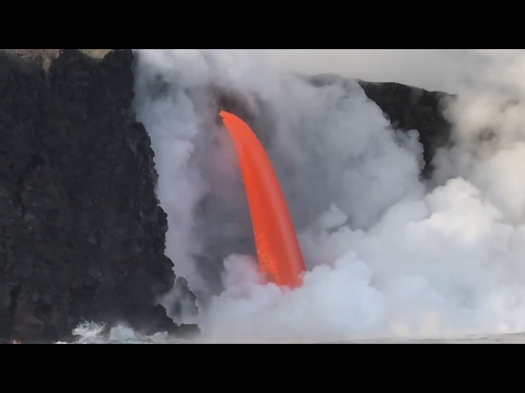 Lo spettacolare getto di roccia fusa che si tuffa nell'oceano dal vulcano Kilauea è di nuovo visibile, dopo una breve pausa causata dal crollo di parte della scogliera – video