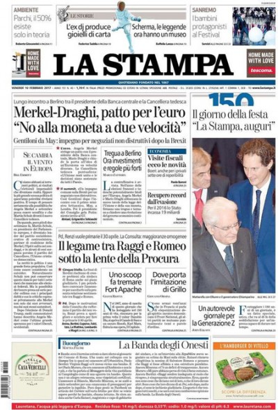 Ci sono notizie diverse in apertura sui quotidiani di oggi: alcuni si occupano ancora della situazione del comune di Roma, con le ipotesi di sostituzione dell’assessore dimissionario Berdini e le indagini che riguardano il sindaco Raggi e alcuni suoi collaboratori, altri titolano sul deposito da parte della Corte Costituzionale delle motivazioni della sentenza sulla legge elettorale. La Stampa apre invece sull’incontro a Berlino fra il cancelliere tedesco Merkel e il presidente della Banca Centrale Europea Draghi, il Sole 24 Ore titola sui dati della lotta all’evasione fiscale nel 2016, e Repubblica segue i movimenti nel Partito Democratico in vista della direzione di lunedì prossimo.