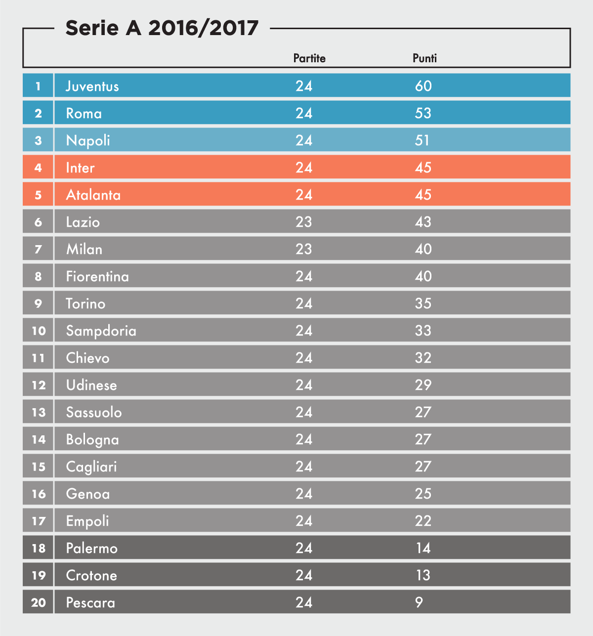 La 24ma giornata di Serie A si può definire una giornata di transizione. Non è successo niente di rilevante e la classifica non è cambiata nella sue zone più interessanti. Lazio e Milan, che giocheranno stasera l’ultima partita del turno, potrebbero renderla più movimentata, e ci sono tutti i presupposti del caso: la Lazio, nonostante le due sconfitte subite a fine gennaio, è ancora una delle squadre più difficili contro cui si possa giocare in questa stagione mentre il Milan si presenterà all’Olimpico con ben sette titolari indisponibili, e rischia di staccarsi dalla zona europea della classifica, forse definitivamente. Fra venerdì e domenica le prime undici squadre della classifica hanno vinto (tranne Milan e Lazio), mentre le ultime nove hanno perso.