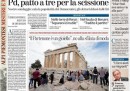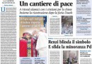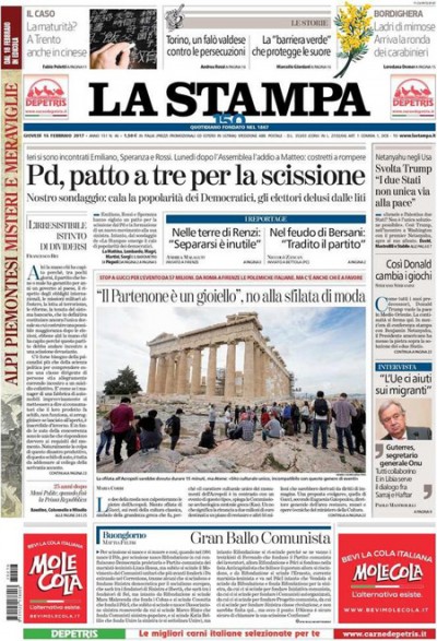 L’apertura dei quotidiani di oggi è dedicata a notizie diverse: alcuni seguono i movimenti delle varie correnti del Partito Democratico in vista dell’assemblea di domenica che dovrebbe fissare la data del congresso, altri si occupano dell’incontro a Washington fra il presidente degli Stati Uniti Trump e il primo ministro isrealiano Netanyahu, mentre le notizie sulle quali aprono gli altri giornali sono la situazione al comune di Roma con le diverse posizioni nel Movimento 5 Stelle dopo le dimissioni dell’assessore Berdini, le indagini sull’ex presidente della Camera Fini, le ipotesi di privatizzazioni allo studio da parte del governo, e la richiesta dell’Unione Europea all’Italia di azioni per ridurre lo smog nelle principali città. I quotidiani sportivi si occupano della sconfitta del Napoli con il Real Madrid nell’andata degli ottavi di Champions League.