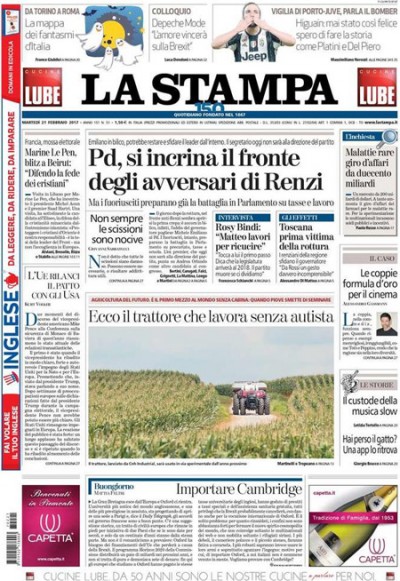 È ancora la scissione della minoranza del Partito Democratico la notizia di apertura per la maggior parte dei quotidiani di oggi, anche in assenza di grosse novità dopo la riunione dell’assemblea del partito di domenica; oggi i giornali sottolineano le possibili divisioni all’interno del gruppo che dovrebbe uscire dal partito, in assenza di conferme ufficiali delle decisioni annunciate. Avvenire titola invece sulla nuova fase della battaglia per la riconquista di Mosul da parte delle truppe che combattono l’ISIS, con l’offensiva delle truppe irachene verso la città.