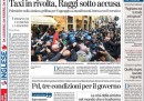 Per la maggior parte dei giornali di oggi l’apertura è dedicata alle proteste e le violenze di ieri a Roma per le manifestazioni di tassisti e ambulanti contro il decreto “milleproroghe” in discussione alla Camera: dopo gli scontri in serata è arrivato un accordo fra il governo e i tassisti per risolvere la questione entro trenta giorni, mentre ci sono polemiche per l’appoggio dato dal sindaco di Roma Raggi ai manifestanti. L’altra notizia presente su tutte le prime pagine è la decisione del presidente della Regione Puglia Emiliano di non lasciare più il Partito Democratico e di volersi candidare alla segreteria, mentre i quotidiani sportivi presentano la partita della Juventus contro il Porto in Champions League, con la decisione della società di escludere Bonucci dopo la lite con l’allenatore durante l’ultima partita.