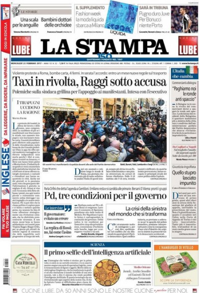Per la maggior parte dei giornali di oggi l’apertura è dedicata alle proteste e le violenze di ieri a Roma per le manifestazioni di tassisti e ambulanti contro il decreto “milleproroghe” in discussione alla Camera: dopo gli scontri in serata è arrivato un accordo fra il governo e i tassisti per risolvere la questione entro trenta giorni, mentre ci sono polemiche per l’appoggio dato dal sindaco di Roma Raggi ai manifestanti. L’altra notizia presente su tutte le prime pagine è la decisione del presidente della Regione Puglia Emiliano di non lasciare più il Partito Democratico e di volersi candidare alla segreteria, mentre i quotidiani sportivi presentano la partita della Juventus contro il Porto in Champions League, con la decisione della società di escludere Bonucci dopo la lite con l’allenatore durante l’ultima partita.