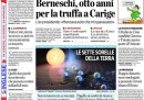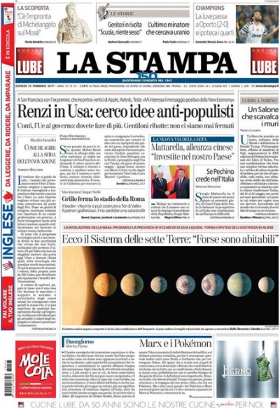 Ci sono molte notizie diverse in apertura sui quotidiani di oggi: il Corriere della Sera e il Messaggero titolano sul piano del governo per intervenire sui noleggi auto con conducente dopo le proteste dei tassisti dei giorni scorsi, la Stampa segue il viaggio negli Stati Uniti di Matteo Renzi, Repubblica apre sulle polemiche per l’assunzione da parte dell’ospedale San Camillo a Roma di due ginecologi non obiettori per garantire l’applicazione della legge 194, il Sole 24 Ore e Avvenire si occupano della richiesta della Commissione Europea all’Italia di intervenire entro aprile per la riduzione del debito, e il Manifesto e il Tempo titolano sulla decisione della giunta Raggi a Roma, lasciata intuire ieri da Beppe Grillo, di voler bloccare il progetto per il nuovo stadio della Roma. Il Giornale, Libero e il Fatto proseguono le loro campagne rispettivamente sul traffico di migranti, sulla crisi delle banche e sulla ricostruzione nelle zone terremotate, e i giornali sportivi celebrano la vittoria della Juventus sul Porto nell’andata degli ottavi di finale della Champions League.