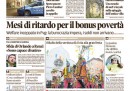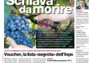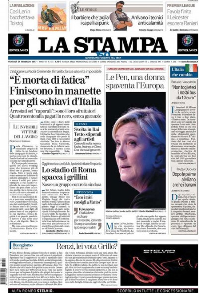 Ci sono notizie diverse in apertura sui giornali di oggi: alcuni si occupano dell’arresto in Puglia per sfruttamento di sei uomini fra i quali il responsabile dell’agenzia interinale che aveva assunto la donna morta nel 2015 di fatica per il troppo lavoro nei campi, il Corriere della Sera apre sui ritardi della ricostruzione nei paesi colpiti dal terremoto in Italia centrale, Avvenire rimane sulla vicenda dell’assunzione di due ginecologi non obiettori in un ospedale romano, il Messaggero pubblica un sondaggio con i primi dati sulla scissione nel Partito Democratico, e i quotidiani sportivi titolano sul licenziamento dell’allenatore Ranieri da parte del Leicester.