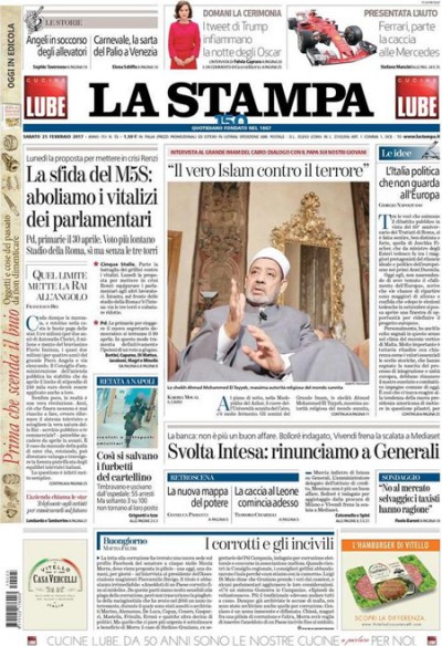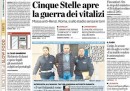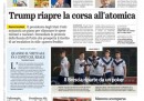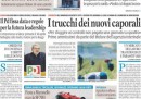 I giornali di oggi dedicano l’apertura a notizie diverse: il Corriere della Sera, il Messaggero e il Tempo si occupano dell’accordo raggiunto ieri sera per la costruzione del nuovo stadio della Roma fra il sindaco di Roma Raggi e la delegazione dei proponenti il progetto, Repubblica e il Giornale aprono sugli arresti per assenteismo in un ospedale di Napoli, e la Stampa parla di una proposta che dovrebbe essere presentata la settimana prossima dal Movimento 5 Stelle per l’abolizione dei vitalizi ai parlamentari, che in realtà sono stati aboliti nel 2011. Il Sole 24 Ore si occupa della rinuncia da parte di Intesa San Paolo alla scalata della compagnia di assicurazioni Generali, il Manifesto segue la proposta del presidente degli Stati Uniti Trump di aumentare le spese per gli armamenti, e l’Unità titola sulla data delle primarie del Partito Democratico, fissate per il 30 aprile.