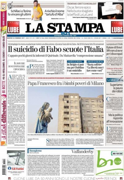 Tutti i quotidiani di oggi aprono sulla morte di Fabiano Antoniani, l’uomo conosciuto come dj Fabo cieco e tetraplegico in conseguenza di un incidente stradale che è andato in Svizzera per sottoporsi a una procedura di suicidio assistito, dopo aver chiesto inutilmente che questa pratica fosse resa possibile anche in Italia. I titoli dei giornali si concentrano anche sulle divisioni e i ritardi che hanno determinato la mancanza di una legge sul fine vita in Italia. I quotidiani sportivi presentano la semifinale di andata di coppa Italia di stasera fra Juventus e Napoli.
