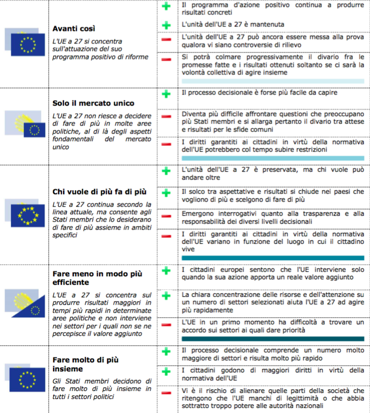 L’approccio 1, Avanti così, significa semplicemente: andiamo avanti a fare le cose come le abbiamo sempre fatte. Prevede quindi un’integrazione graduale fra gli stati membri, senza però la possibilità di intervenire su diversi temi rilevanti, e quindi col rischio di esporsi in continuazione – come ora – ad accuse di inefficienza (o viceversa, di eccessiva ingerenza nelle politiche di ciascuno stato su alcuni singoli temi). Il secondo approccio – Solo il mercato unico – è forse il favorito dai più europeisti fra gli euroscettici, diciamo: concentriamoci solo sulle questioni economiche – cioè sulla libera circolazione di beni, servizi e denaro – e lasciamo perdere il resto, cioè diritti civili e sociali e politica internazionale. Per contro, l’approccio 5 – Fare molto di più insieme – è il sogno di ogni europeista: diamo più poteri all’Unione, tutti quanti, col rischio però di non avere la necessaria legittimità politica per farlo dati i recenti successi dei partiti nazionalisti e “sovranisti”.