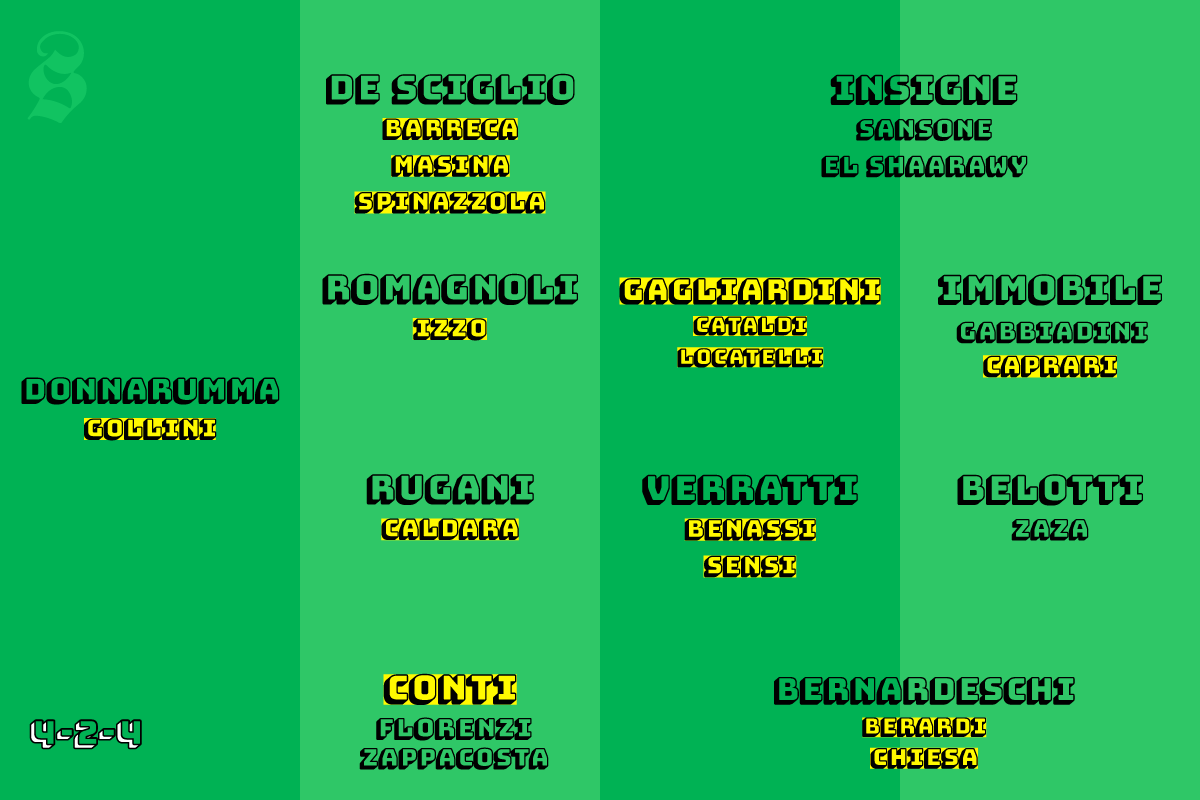 Il 3-4-3 è il modulo usato nell’ultima partita dell’Italia, l’amichevole pareggiata 0-0 contro la Germania a novembre. Ma sia negli stage che negli allenamenti della nazionale maggiore, Ventura sta lavorando per allontanarsi dal 3-5-2 “ereditato” dalla gestione di Antonio Conte per introdurre gradualmente il 4-2-4, che sembrerebbe il modulo giusto per sfruttare al massimo l’abbondanza di esterni di qualità in circolazione. Con il 4-2-4 rimarrebbero probabilmente tutti i giocatori impiegati nel 3-4-3, con l’aggiunta di un centravanti, ed è probabile che in Russia vedremo una nazionale simile a questa: