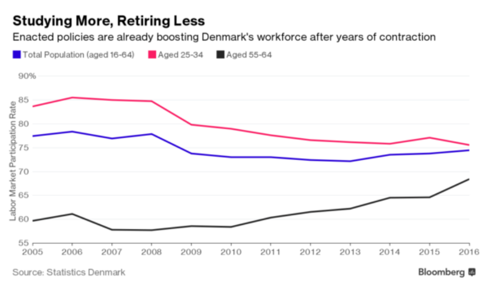 La proposta originale è stata poi scartata dopo essere diventata l’oggetto di una lotta di potere tra il governo e il suo maggiore alleato in Parlamento, il Partito del Popolo Danese, che ha posizioni anti-immigrazione. Dopo un rimpasto il nuovo governo sta lavorando a un nuovo piano, che dovrebbe essere presentato entro l’estate. Per ottenere le risorse necessarie per finanziare i tagli alle tasse servono entrate più alte, una spesa minore, o una combinazione di entrambe le cose. Il governo danese crede che il miglior modo per centrare questo obiettivo sia far entrare più persone nel mercato del lavoro. Dal momento che la Danimarca è già vicina alla piena occupazione (a dicembre il tasso di disoccupazione è stato del 3,4 per cento) e che attrarre altri lavoratori migranti è un terreno molto scivoloso politicamente (dopo la crisi dei migranti del 2015 il governo ha imposto controlli ai confini e rafforzato le normative), la soluzione più ovvia è spingere a lavorare i più giovani e gli anziani.