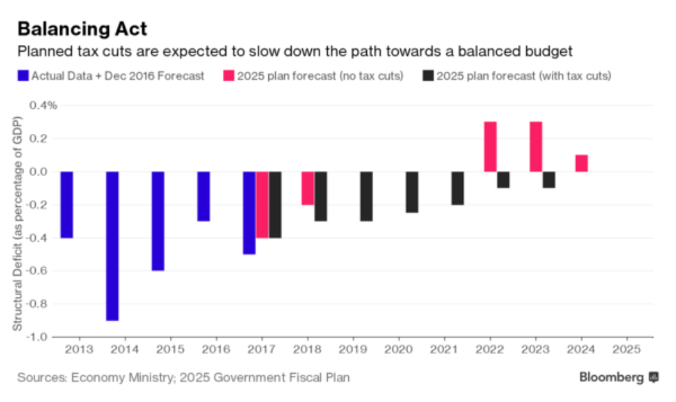 Il piano fa parte dello spostamento della Danimarca verso destra, annunciato all’inizio del millennio da un altro primo ministro del Partito Liberale chiamato Rasmussen, Anders Fogh. A novembre l’iniziativa per ridurre le tasse in una delle società più tassate del mondo ha ottenuto nuovo slancio quando due raggruppamenti danesi sostenitori del libero mercato sono entrati nel governo di minoranza dei Liberali. Per il momento Rasmussen non ha ancora presentato una proposta dettagliata, ma gran parte del lavoro preparatorio è già stato fatto. Il grafico qui sotto mostra le previsioni di bilancio, che si basano sul piano dell’anno scorso per ridurre l’aliquota più alta dell’imposta sul reddito del cinque per cento e aumentare gli stipendi dei lavoratori con il reddito più basso del sette per cento in media. Su questa base, il pareggio di bilancio sarebbe stato posticipato di cinque anni, mantenendo il deficit espresso come percentuale del PIL a livelli gestibili.