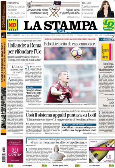 I principali quotidiani di oggi aprono sull’intervista televisiva di ieri del presidente del Consiglio Gentiloni, che ha dichiarato che il suo governo vuole durare fino alla fine della legislatura nel 2018 e che ha intenzione di ridurre le tasse sul lavoro, confermando la sua fiducia nel ministro dello Sport Lotti dopo il coinvolgimento nell’inchiesta sugli appalti CONSIP. Su quest’inchiesta titolano invece il Giornale e il Fatto, mentre la Stampa apre con un’intervista al presidente francese Hollande e i giornali sportivi commentano i risultati della domenica calcistica, con il pareggio della Juventus e le vittorie di Inter e Torino, che ha battuto il Palermo con tre gol di Belotti.