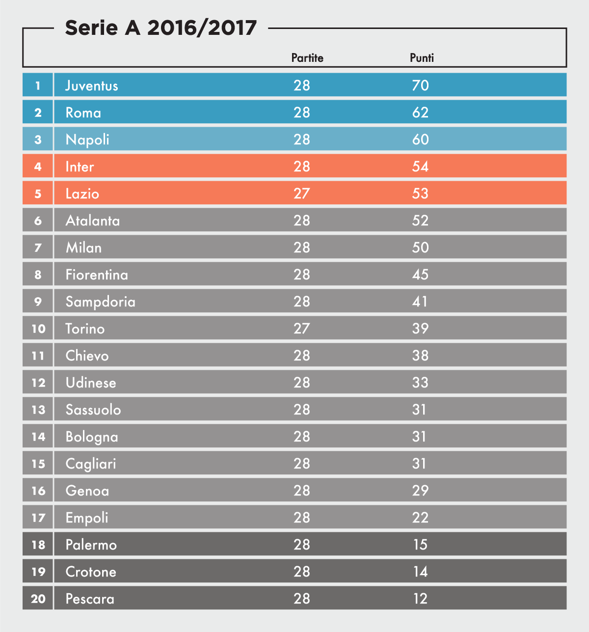 Venerdì sera la Juventus ha vinto 2-1 contro il Milan grazie a un rigore segnato negli ultimi secondi di partita da Paulo Dybala. L’incontro ha generato un sacco di polemiche, ma sulla superiorità in campo della Juventus c’è poco da dire: ha avuto più possesso palla, ha tirato più in porta, ha avuto più occasioni ed è stata in costante controllo del gioco. Sabato invece, nel derby di Genova, anche la Sampdoria ha dimostrato di essere superiore al Genoa, nonché una squadra molto promettente, vincendo 1-0: un risultato giusto per quello che si è visto nei novanta minuti. La 28ma giornata di Serie A si concluderà stasera con il posticipo tra Lazio e Torino.