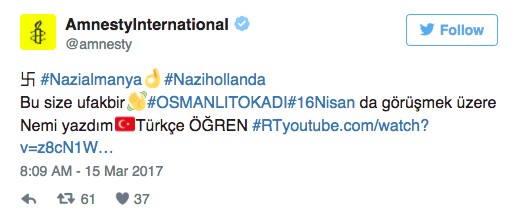Il tweet contiene una svastica, alcuni hashtag che si riferiscono al nazismo, un video celebrativo del presidente turco Recep Tayyip Erdoğan e varie scritte fra cui “ci vediamo il 16 aprile”. È la data del referendum costituzionale in Turchia che deciderà se rafforzare i poteri del presidente, una riforma promossa e sponsorizzata dallo stesso Erdoğan. I riferimenti al nazismo e ai Paesi Bassi si legano probabilmente ai diversi litigi diplomatici che Erdoğan ha avuto con alcuni leader europei la scorsa settimana, dopo che in diversi paesi ai membri del governo turco è stato impedito di tenere comizi politici in vista del referendum (probabilmente perché non vogliono legittimare un governo autoritario e ultra-nazionalista come quello di Erdoğan).