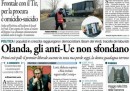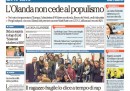 La maggior parte dei giornali di oggi apre sui dati degli exit poll delle elezioni che si sono tenute ieri nei Paesi Bassi, che danno la vittoria ai liberali del primo ministro uscente Rutte e risultati inferiori alle attese all’estrema destra di Wilders. Il Fatto e il Manifesto si occupano invece del voto del Senato che ha respinto la mozione di sfiducia presentata dal Movimento 5 Stelle nei confronti del ministro dello Sport Lotti, l’Unità titola sulla tesi sostenuta dagli avvocati di Beppe Grillo sulla sua non responsabilità per quanto scritto sul suo blog, e il Giornale ipotizza una nuova manovra economica sulla casa da parte del governo.