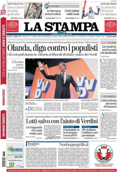 La maggior parte dei giornali di oggi apre sui dati degli exit poll delle elezioni che si sono tenute ieri nei Paesi Bassi, che danno la vittoria ai liberali del primo ministro uscente Rutte e risultati inferiori alle attese all’estrema destra di Wilders. Il Fatto e il Manifesto si occupano invece del voto del Senato che ha respinto la mozione di sfiducia presentata dal Movimento 5 Stelle nei confronti del ministro dello Sport Lotti, l’Unità titola sulla tesi sostenuta dagli avvocati di Beppe Grillo sulla sua non responsabilità per quanto scritto sul suo blog, e il Giornale ipotizza una nuova manovra economica sulla casa da parte del governo.