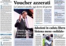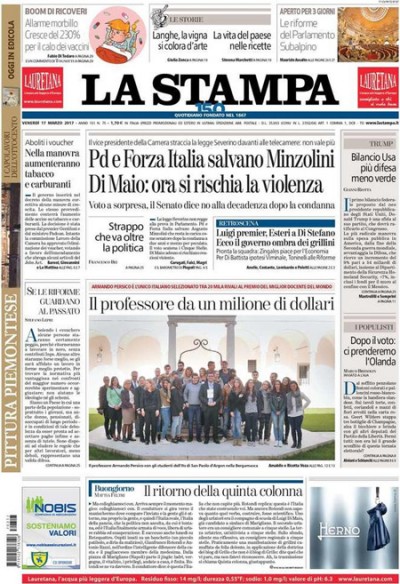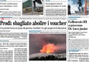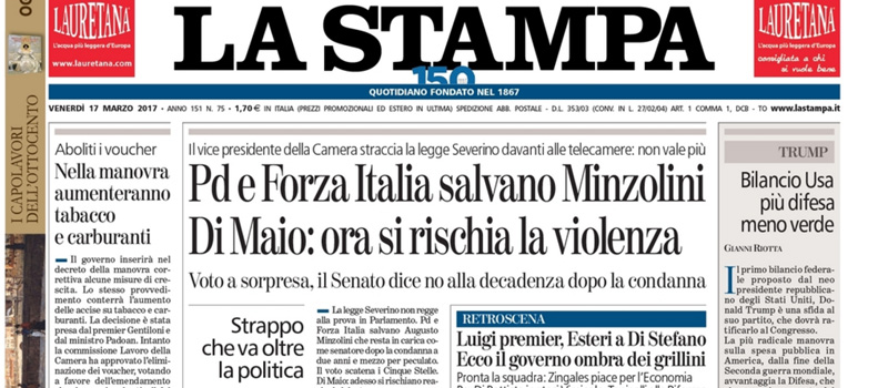 Sono due le notizie principali in apertura sui principali quotidiani di oggi: il voto con il quale il Senato ha respinto la decadenza da senatore di Augusto Minzolini, dopo la sua condanna a due anni e mezzo per peculato, e le parole del vicepresidente della Camera del Movimento 5 Stelle Di Maio che ha evocato possibili reazioni violente, e la decisione del governo di eliminare i voucher con un decreto che dovrebbe essere approvato oggi per annullare il referendum richiesto dalla CGIL che voleva cancellarli.