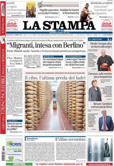 Molte notizie diverse sono in apertura sui quotidiani di oggi: il divieto deciso da Stati Uniti e Regno Unito di portare in cabina computer e tablet sui voli provenienti da paesi del Medio Oriente e del Nord Africa per paura di attentati, il vertice di Roma nell’anniversario della fondazione dell’Unione Europea e la paura di incidenti durante le manifestazioni previste per sabato, l’accoglienza dei migranti, sulla quale la Stampa intervista il ministro dell’Interno Minniti, la manifestazione di Locri nel giorno del ricordo delle vittime della mafia, e i dati dell’ISTAT sul lavoro nelle famiglie italiane.