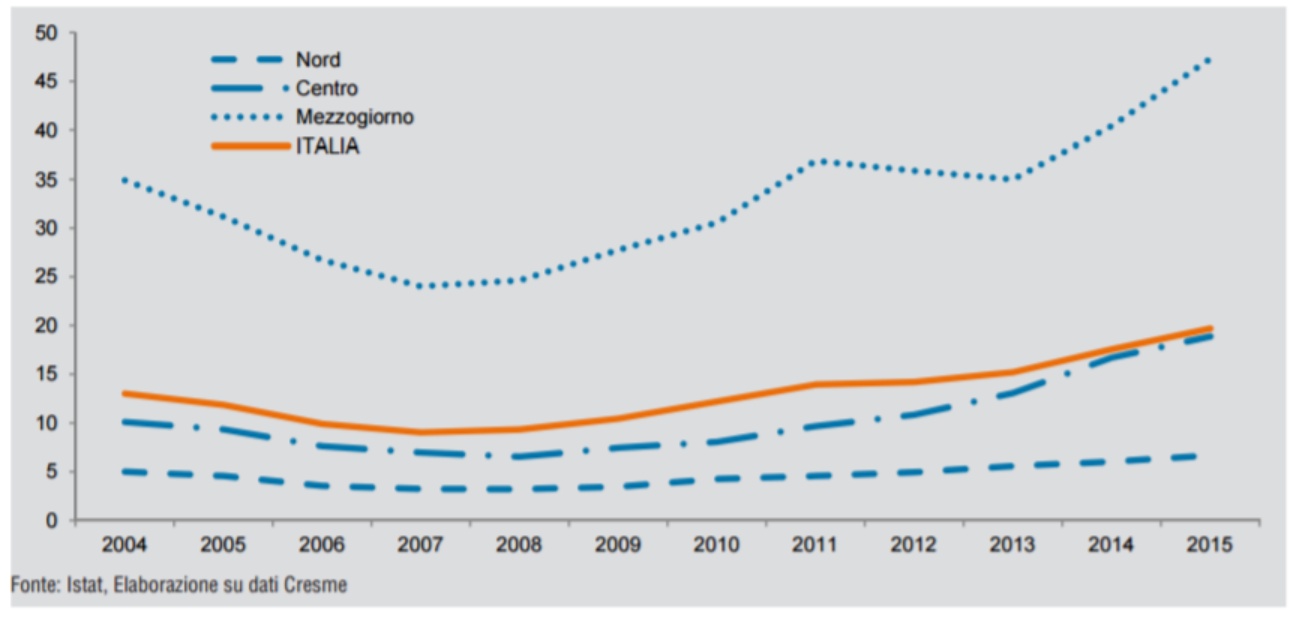 Secondo quasi tutti i principali indicatori, dall’inizio della crisi economica del 2008 il divario tra il Nord e il Sud dell’Italia è continuato ad aumentare: anche perché l’economia italiana aveva smesso di crescere sensibilmente molto prima dell’inizio della crisi globale. La recessione ha fatto perdere al Sud 12 punti di Prodotto Interno Lordo (PIL), il doppio di quanti ne sono stati persi al Nord. Anche se nel corso del 2015, l’ultimo anno per cui abbiamo dati completi, il Sud ha mostrato segni di ripresa leggermente più rapidi di quelli del Nord, oggi l’Italia è ancora divisa in quelle che sembrano due economie profondamente diverse, che producono due mondi concretamente diversi in molti modi differenti. Abbiamo raccolto dieci numeri per cercare di capire cosa significa oggi questa differenza di sviluppo che da decenni l’Italia cerca di colmare, con risultati deludenti. Molti dati provengono dal rapporto SVIMEZ 2016, una delle raccolte più complete di statistiche e analisi sulla situazione meridionale (le altre fonti sono segnalate nei singoli paragrafi).