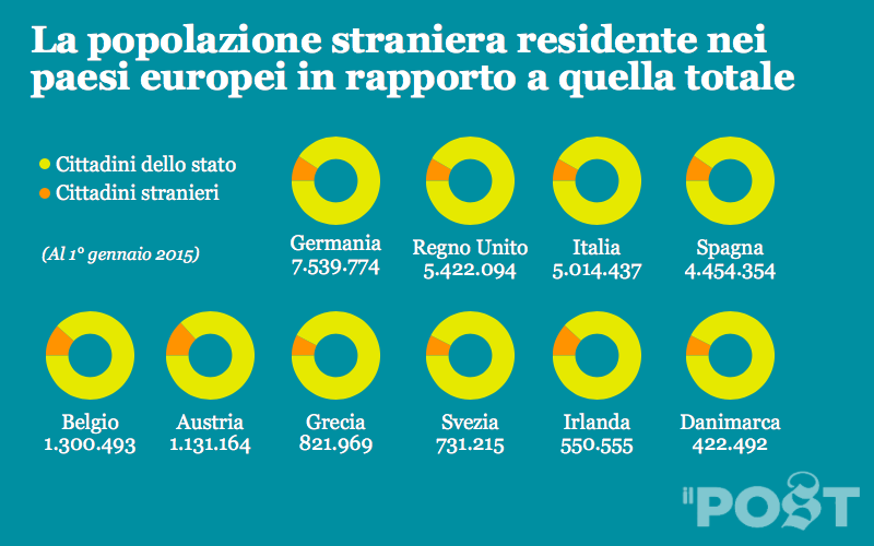In termini assoluti, l’Italia si trova al terzo posto per numero di stranieri residenti, dopo la Germania e il Regno Unito. In percentuale sul totale, invece, al primo posto c’è l’Austria, dove gli stranieri sono il 13,2 per cento della popolazione residente, seguita poi dall’Irlanda (11,9%) e dal Belgio (11,6%), tutti dati superiori all’8,3% italiano.