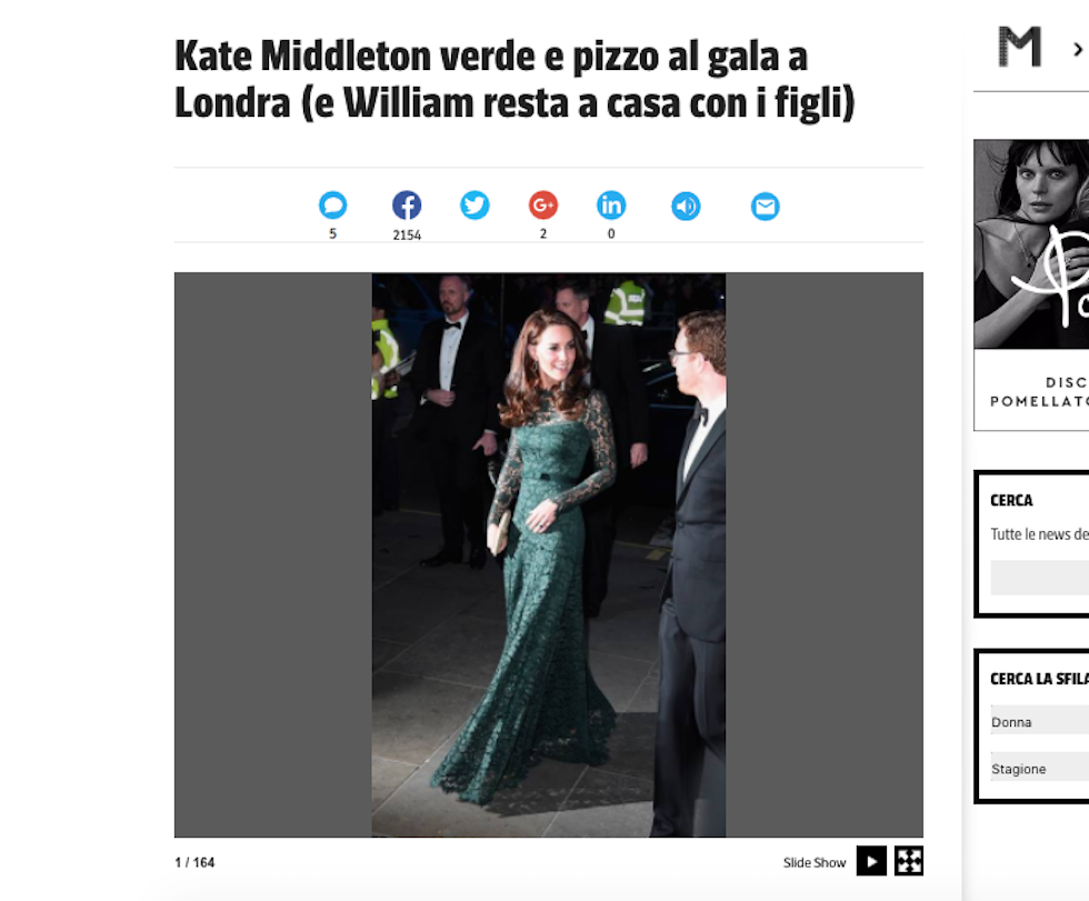 “Kate Middleton verde e pizzo al gala a Londra (e William resta a casa con i figli)”