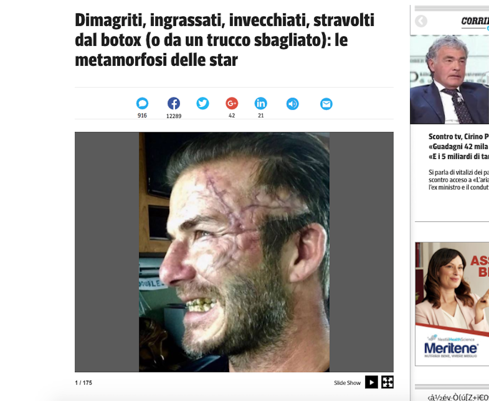 “Dimagriti, ingrassati, invecchiati, stravolti dal botox (o da un trucco sbagliato): le metamorfosi delle star”, la didascalia della prima foto (così come il richiamo in home page) aggiunge: “Lo riconoscete? Per scoprire chi è andate fino all’ultima foto della gallery”. L’ultima di 175.