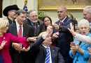 Un po’ a sorpresa le persone più interessanti da fotografare questa settimana erano soprattutto politici, e alcune immagini raccontano un po’ di notizie della settimana. Ci sono la prima ministra scozzese Nicola Sturgeon che lavora sul divano, scalza, alla lettera da mandare a Theresa May per chiedere un secondo referendum per l’indipendenza della Scozia (ma niente a che vedere con questa foto di Kellyanne Conway); l’ex presidente della Corea del Sud Park Geun-hye diretta in tribunale per l’udienza sul mandato di arresto nei suoi confronti; e Donald Trump che firma una legge sulla responsabilità scolastica.