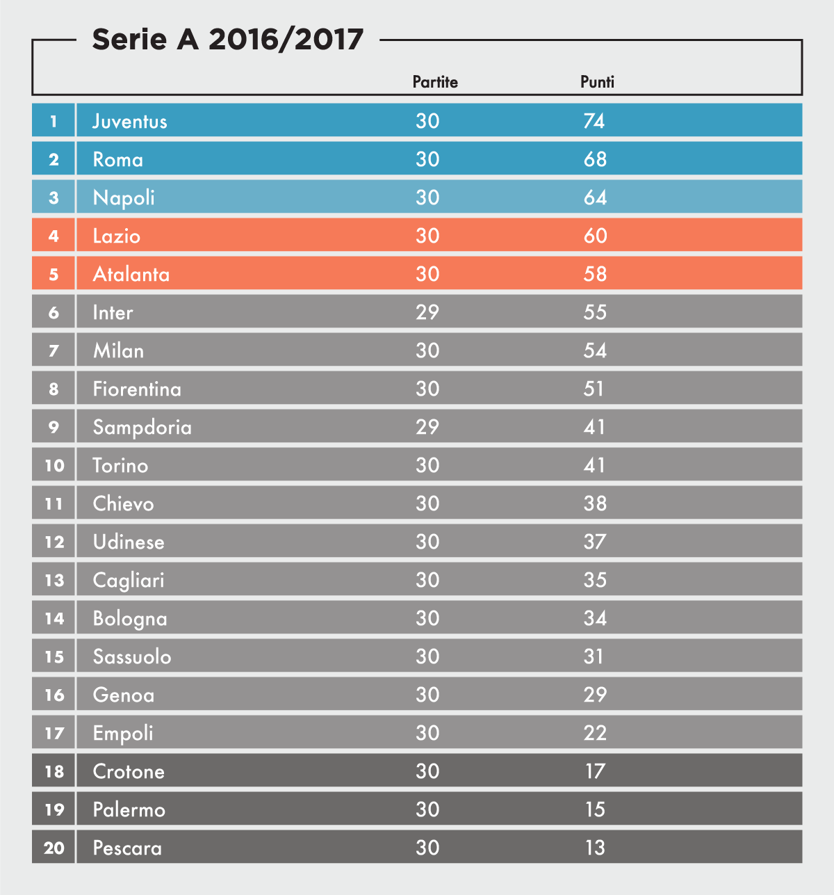 Quando una squadra rimane due mesi senza fare punti, in qualsiasi circostanza si trovi è destinata a perdere parecchie posizioni. Non è così per l’Empoli, che non fa un punto dal 5 febbraio ma è sempre rimasta ferma al proprio posto, il 17simo, quello appena sopra la zona retrocessione. Insieme, le ultime tre in classifica hanno vinto nove partite dall’inizio della stagione. Ultimamente però sono riuscite ad accorciare il loro distacco, chi più chi meno. Grazie alla vittoria di ieri contro il Chievo, il Crotone ora è la squadra nella miglior condizione per poter tirarsi fuori dalla zona retrocessione. Ma i punti di distanza sono ancora cinque, e l’Empoli ha un calendario decisamente più alla sua portata: alla prossima giornata ospiterà il Pescara, mentre il Crotone giocherà contro l’Inter.