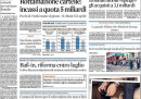 La maggior parte dei giornali di oggi apre sulle tensioni nella maggioranza di governo dopo l’elezione a presidente della commissione Affari Costituzionali del Senato di un esponente di Area Popolare, che ha ricevuto i voti delle opposizioni, al posto del candidato presentato dal Partito Democratico, e sulle possibili conseguenze sulla stabilità del governo di questo voto. Avvenire e l’Unità si occupano invece del bombardamento chimico in Siria di martedì, il Giornale si preoccupa per le ipotesi di manovre economiche che “mettano le mani in tasca” agli italiani, il Manifesto segue la trattativa fra governo e sindacati per la crisi di Alitalia, e i quotidiani sportivi titolano sulla qualificazione per la finale di Coppa Italia della Juventus, che incontrerà la Lazio nonostante la sconfitta per 3-2 a Napoli.