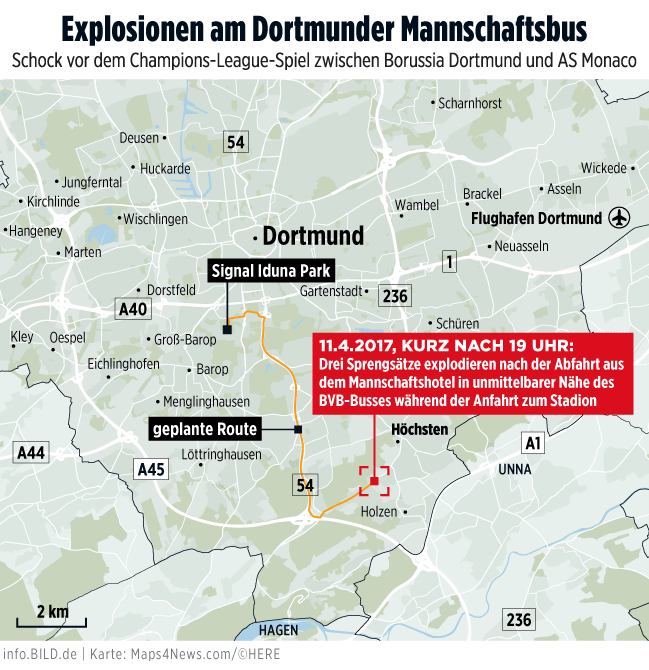 Secondo la polizia, durante le esplosioni non c’è stato alcun pericolo per le persone allo stadio. L’annunciatore Norbert Dickel ha informato gli spettatori dell’incidente e ha chiesto loro di restare all’interno dello stadio per trenta minuti e di mantenere la calma in modo da garantire un’uscita ordinata. Hans-Joachim Watzke, amministratore delegato del Borussia Dortmund, ha spiegato che la squadra è in uno stato di shock: «Spero che sia in grado di essere competitiva domani in campo». La polizia ha attivato un importante dispositivo di sicurezza intorno allo stadio e ha esaminato la zona anche con l’aiuto di un drone. Le autorità hanno fatto sapere che le esplosioni sono state causate da ordigni relativamente potenti.