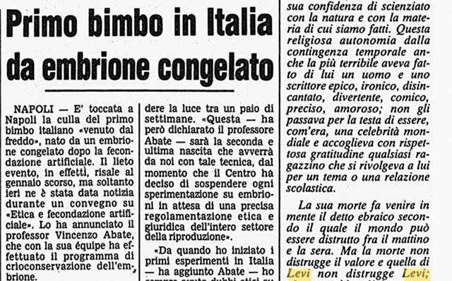Il giorno dopo il suo funerale, lo scrittore Ferdinando Camon, che negli anni precedenti aveva realizzato una lunga intervista con Primo Levi, ricevette una lettera dello scrittore: «Se m’è arrivata al martedì», scrisse Camon su Avvenire, «doveva averla imbucata il sabato: dunque durante la passeggiata che faceva ogni mattina. La apro: un inno alla vita, un vortice di programmi, speranze, attese, da riempire settimane, mesi e anni». Sulla prima pagina del Corriere della sera di domenica, accanto al ricordo di Levi scritto da Claudio Magris, c’era la notizia del primo bambino nato in Italia da un embrione congelato. Ha compiuto trent’anni.