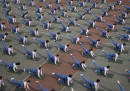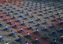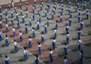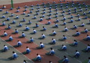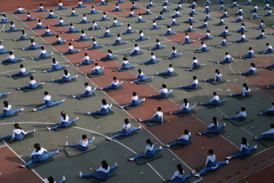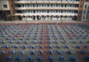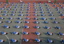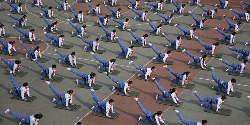 A ripensare alla lezioni di educazione fisica alle elementari vengono in mente le partite a palla prigioniera, a palla avvelenata o a tutte le diverse versioni di giochi-con-la-palla escogitate da maestre e maestri: niente a che vedere con l’ordinata sessione di ginnastica e yoga a cui hanno partecipato decine di studenti della scuola elementare Mingzhu, a Jinan, in Cina, organizzata durante una pausa dalle lezioni per spiegare agli studenti l’importanza di mantenersi in forma e in salute. Le foto sono state scattate lo scorso 13 aprile: sembrano tutte uguali, in una ripetizione di gesti e posizioni quasi ipnotica. A guardarle meglio, in alcune si nota l’elemento un po’ fuori posto – un movimento impreciso, un braccio che penzola, una postura stanca – che interrompe la ripetizione ordinata e rende tutto più reale.