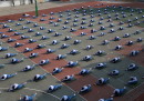 Foto ipnotiche di decine di bambini intenti a fare ginnastica a scuola, in Cina